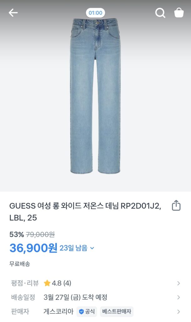 4. 👖 GUESS 여성 롱 와이드 저온스 데님